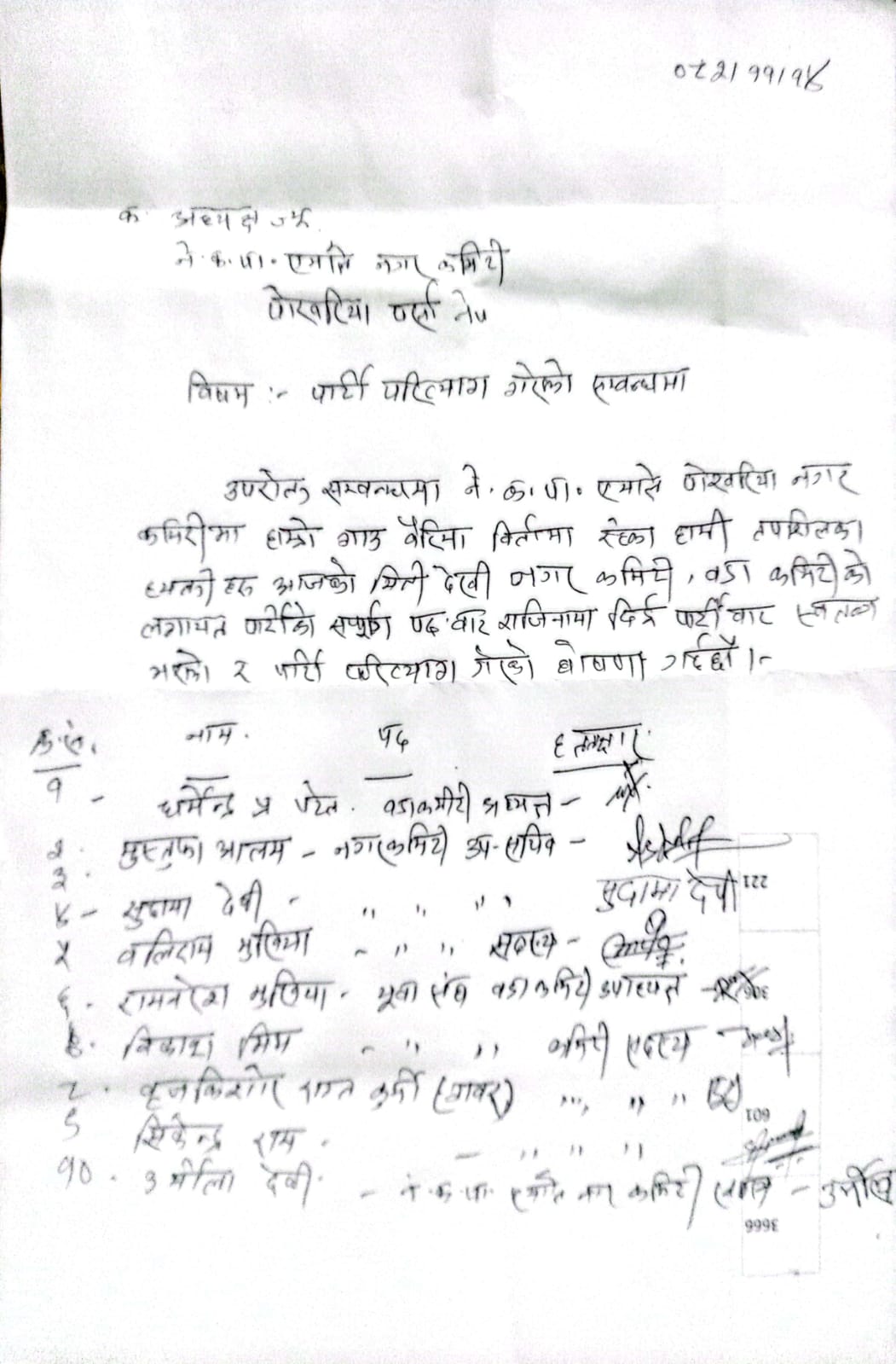 नगर कमिटीका उप–सचिव मुस्तुफा आलम, वडा नं. ९ का वडा कमिटी अध्यक्ष धर्मेन्द्र पटेल, नगर कमिटी महिला उप–सचिव सुदामा देवी, नगर कमिटी सदस्य बलिराम मुखिया, राष्ट्रिय युवा संघ नेपाल पोखरिया कमिटीका उपाध्यक्ष रामनरेश मुखिया, सदस्य विकास मिश्र, बृजकिशोर राउत कुर्मी (गबर), सिकेन्द्र राम र उर्मिला देवीले संयुक्त विज्ञप्ति जारी गर्दै पार्टी छाडेको जानकारी दिएका हुन्।